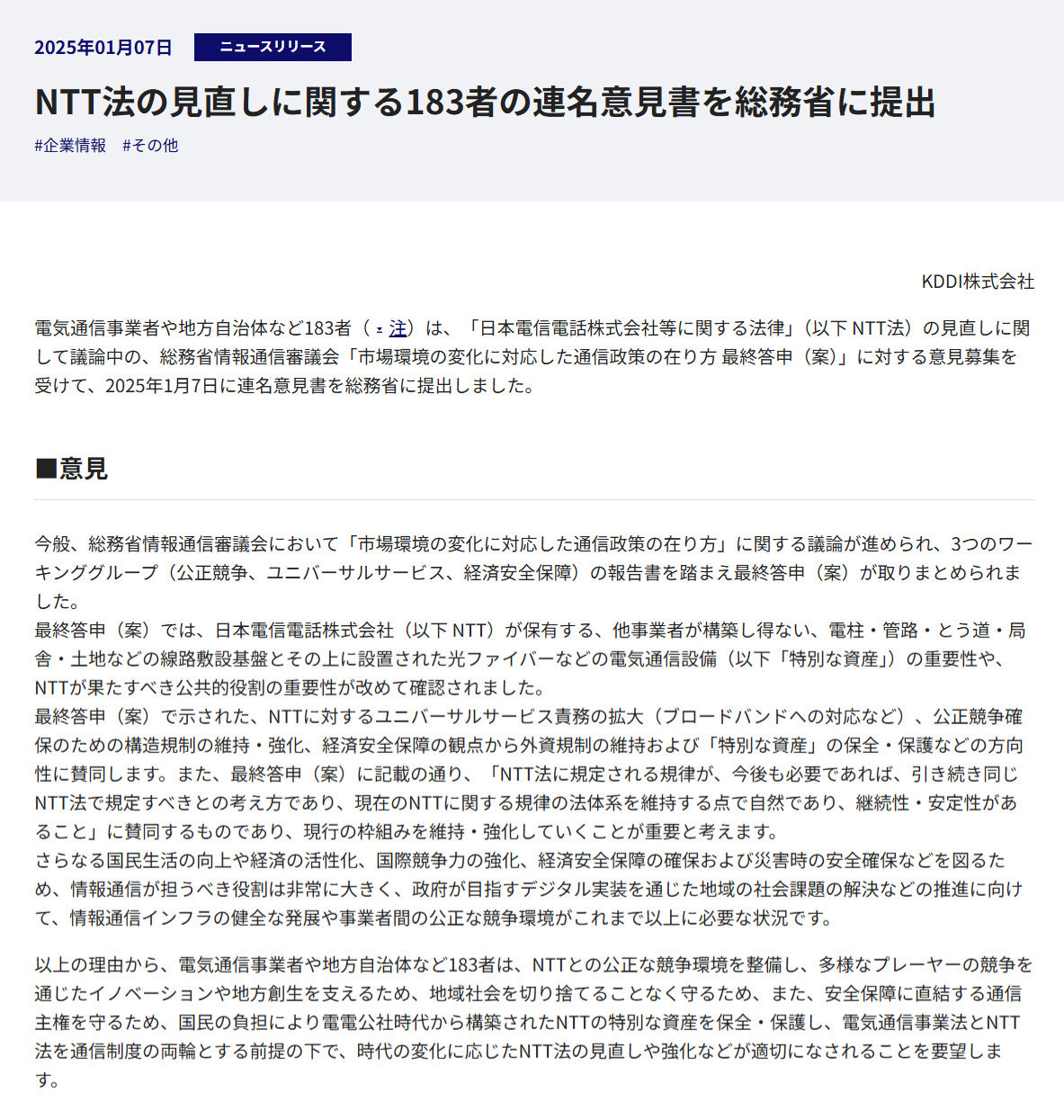 電気通信事業者ら183者、「NTT法」の見直しに対する連名意見書を総務省に提出