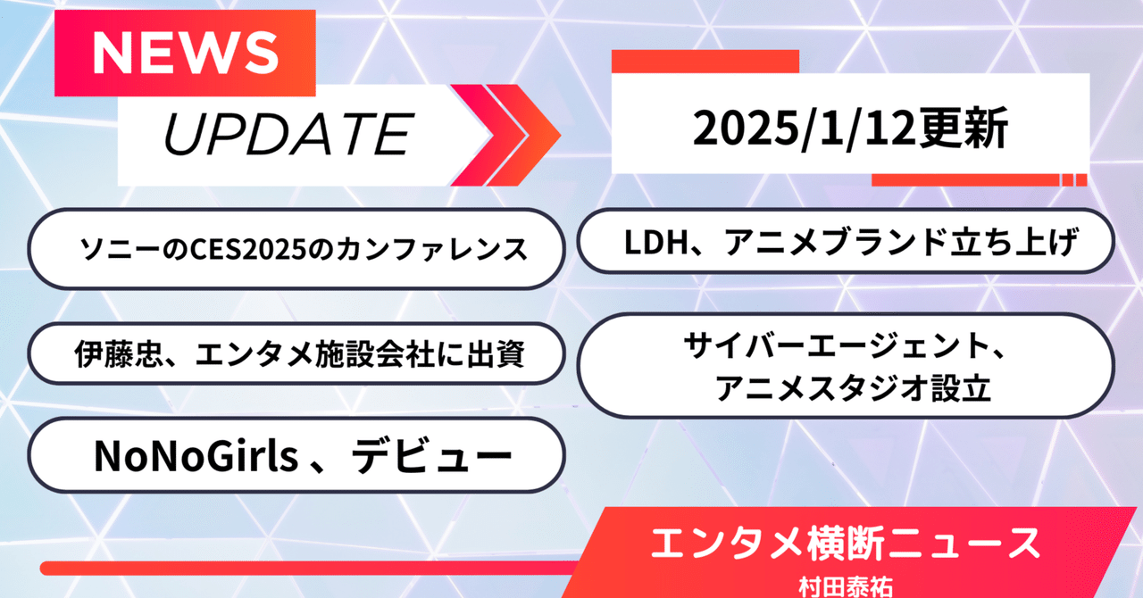 【#エンタメ横断ニュース】ソニーのCESカンファレンス、LDHがアニメブランド立ち上げ、伊藤忠がエンタメ施設会社に出資、サイバーエージェントがアニメスタジオ設立、NoNoGirls デビュー(25/1/|村田泰祐