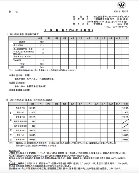 串カツ田中 月次業績(2024年12月度) : 官報ブログ