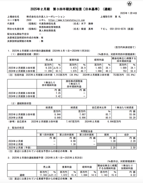 北の達人コーポレーション 2025年2月期第3四半期決算 : 官報ブログ