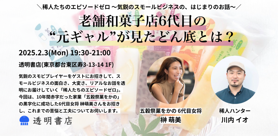 【イベント】2月3日19時半~より、蔵前の透明書店で老舗和菓子屋「五穀祭菓 をかの」6代目女将、榊萌美さんとトークします!10年間赤字だった家業をV字回復させた榊さんの苦悩と工夫を深掘り!会社員にも、事業をしている人にもヒントがあるはずです。配信あり! 詳細↓ …i.peatix.com