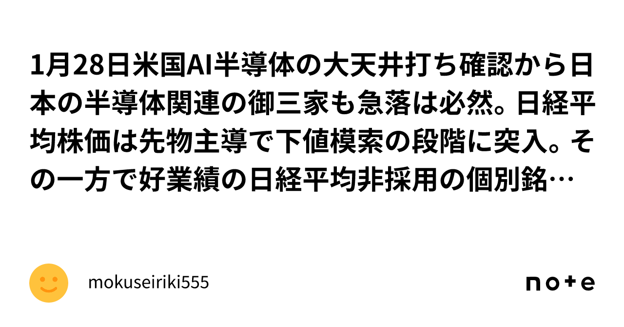 1月28日米国AI半導体の大天井打ち確認から日本の半導体関連の御三家も急落は必然。日経平均株価は先物主導で下値模索の段階に突入。その一方で好業績の日経平均非採用の個別銘柄が堅調に推移。5032、4813|mokuseiriki555