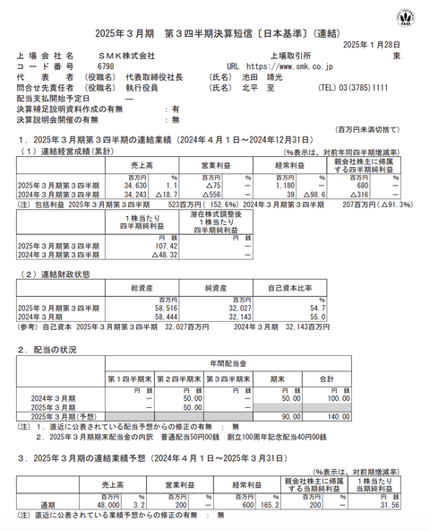 SMK 2025年3月期第3四半期決算 kanpo.blog.jp/archives/43945… 売上高億3000万円 営業利益▲7500万円 経常利益億8000万円 純利益億8000万円