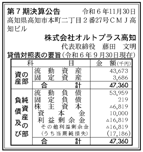 ゲーム運営・開発・デバックなど「オルトプラス高知」決算公告(第7期) : 官報ブログ