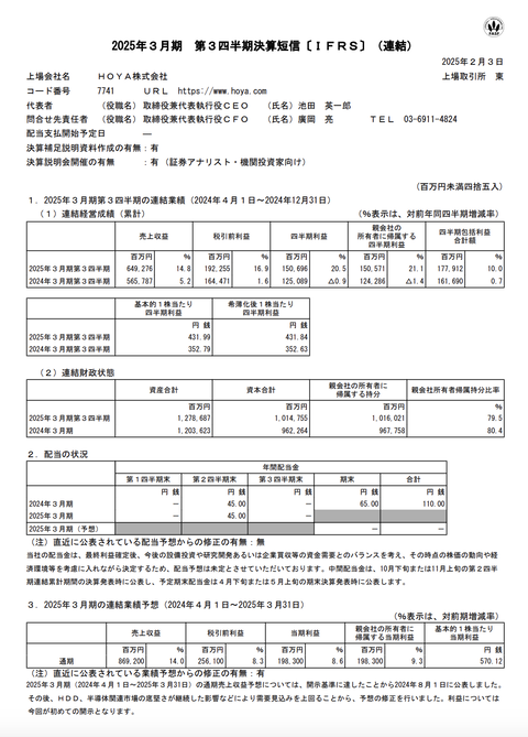 HOYA 2025年3月期第3四半期決算 : 官報ブログ