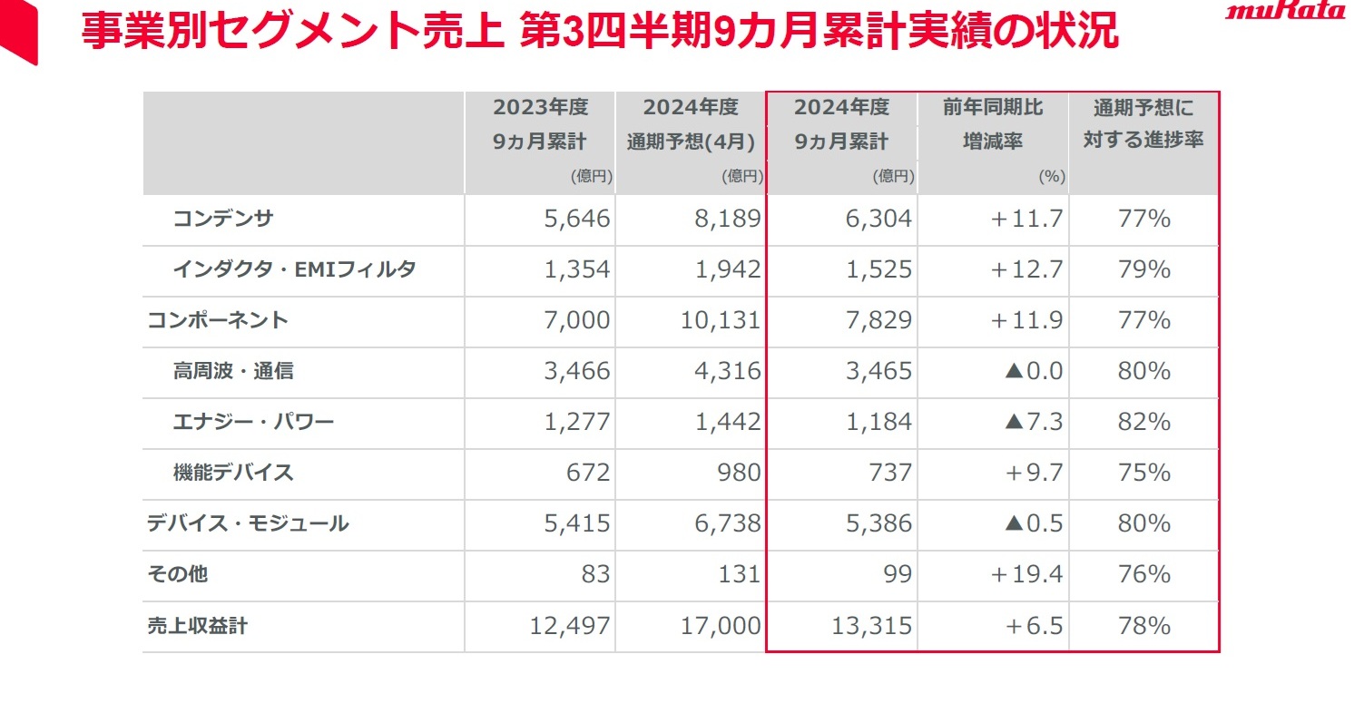 村田製作所の24年4〜12月は増収増益、AIサーバ向けMLCC堅調