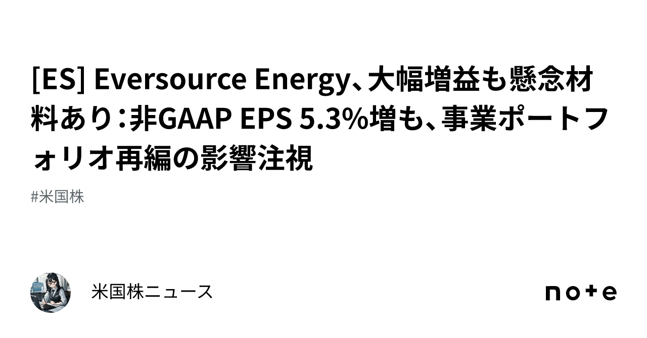[ES] Eversource Energy、大幅増益も懸念材料あり:非GAAP EPS 5.3%増も、事業ポートフォリオ再編の影響注視|米国株ニュース