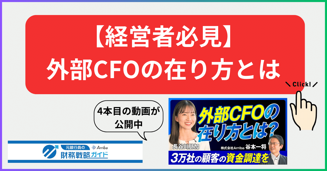 YouTube第4段公開!【経営者必見】外部CFO/資金調達コンサルの在り方!|元銀行員による銀行調達を中心とした財務担当者のアウトソーシング事業 株式会社Arriba谷本