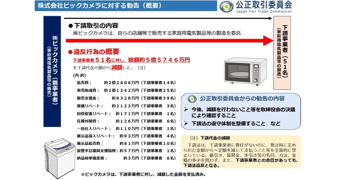 ビックカメラで下請法違反 約5億5800万円を不当に減額 公取委が勧告