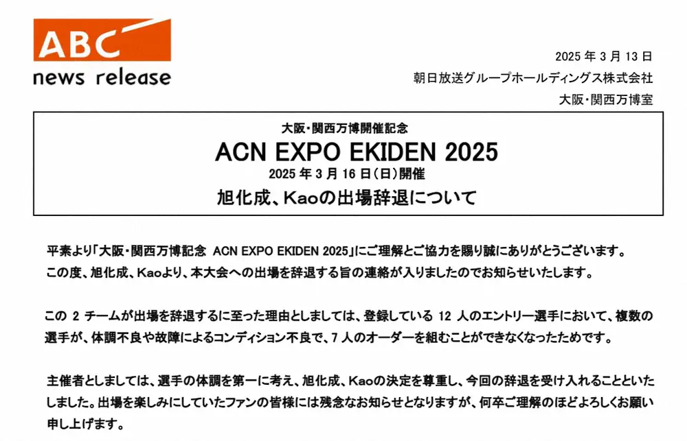 旭化成とKaoがエキスポ駅伝出場辞退「複数の選手が体調不良や故障によるコンディション不良」主催者発表 - スポニチ Sponichi Annex スポーツ