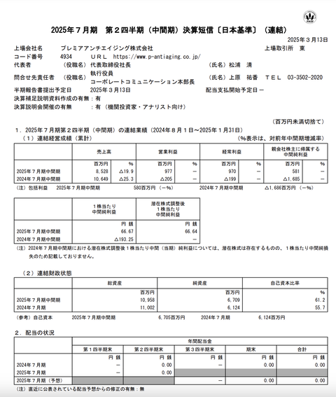 プレミアアンチエイジング 2025年7月期第2四半期決算 : 官報ブログ