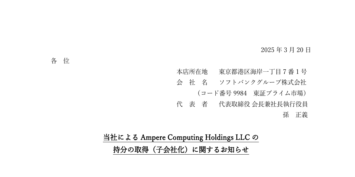ソフトバンクグループ 当社によるAmpere Computing Holdings LLCの持分の取得に関するお知らせ tdview.net/v/140120250319…