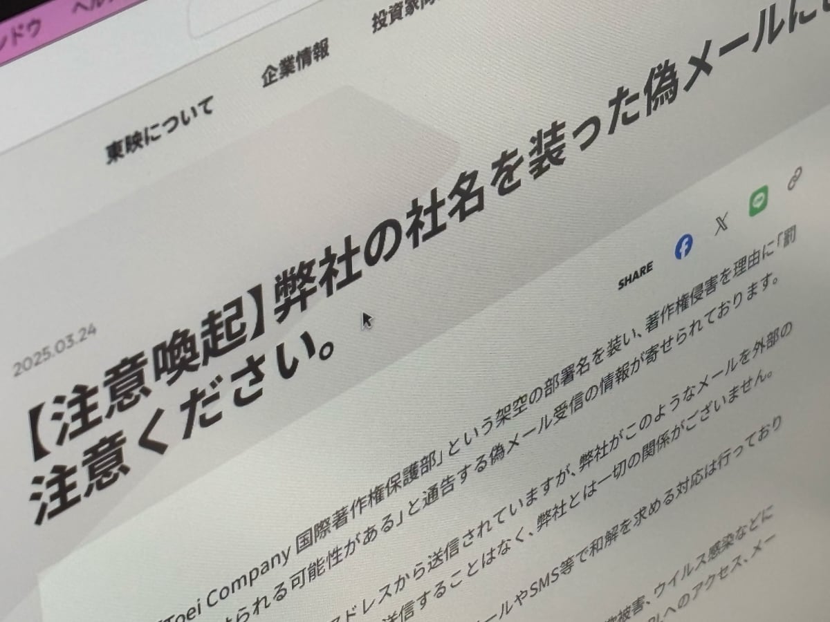 東映、偽メールに注意喚起 著作権侵害を理由に「罰金を課せられる可能性がある」と脅し