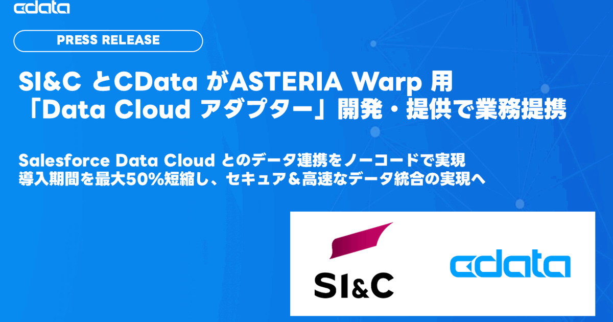 【プレスリリース】 CData × SI&C が業務提携し、ASTERIA Warp 向け「Salesforce Data Cloud アダプター」を共同開発! 💡ノーコードでERP、CRM、MAツールなど100以上のシステムと高速連携 ⏱️導入期間を最大50%短縮 📊データ解析をリアルタイムで実現 詳しくは👇 cdata.com/jp/news/202504…