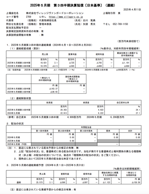 ヴィレッジヴァンガードコーポレーション 2025年5月期第3四半期決算 : 官報ブログ
