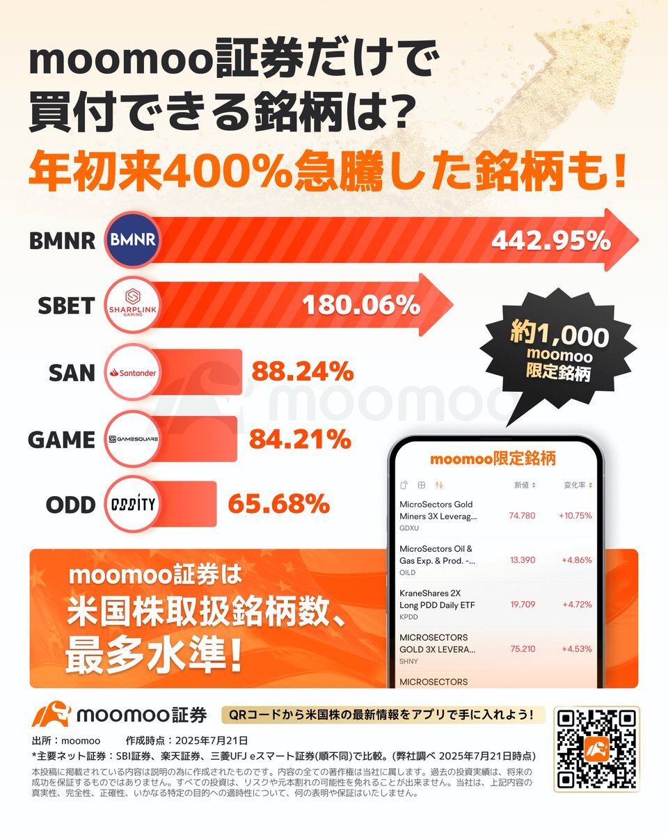他にはない"銘柄を探すならmoomoo証券 規制法案可決で暗号資産関連株急騰!人気暗号資産関連株である<BMNR>と<SBET>を、今買付できるのはmoomoo証券だけ! さらに、今初めての入金でエヌビディアなど人気株を無料ゲット! ↓↓今すぐ確認↓↓ j.jp.moomoo.com/0r0arN #moomoo証券 pic.x.com/AYluesam3H