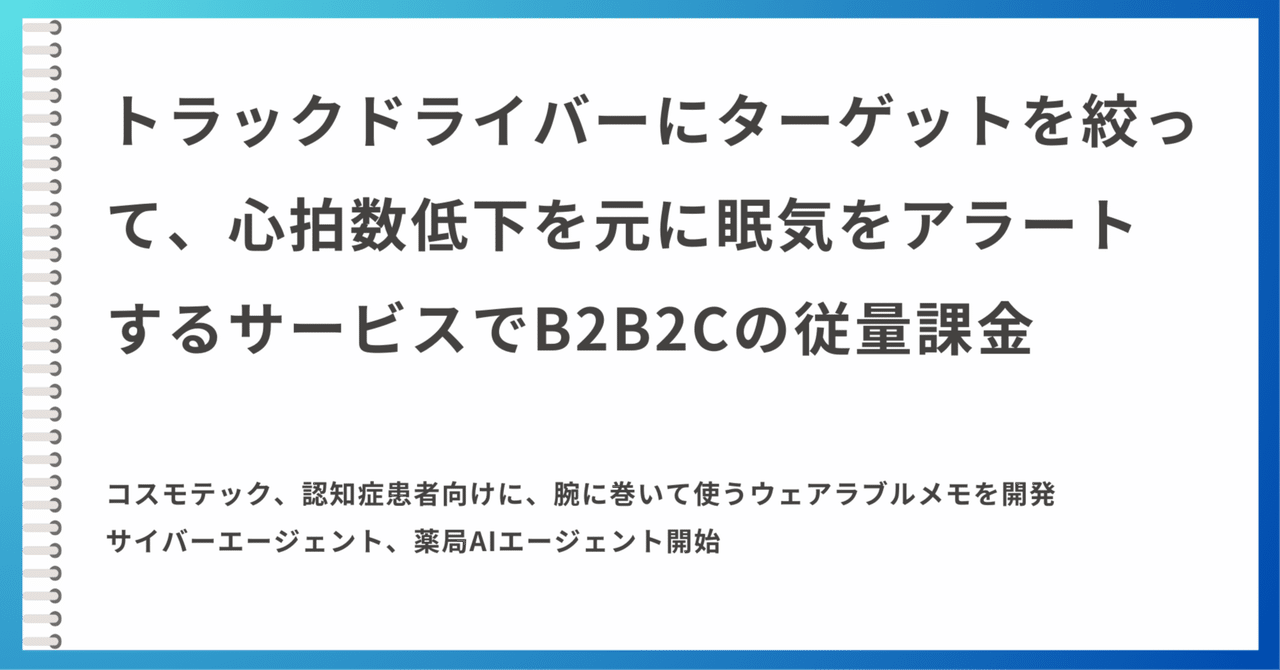 トラックドライバーにターゲットを絞って、心拍数低下を元に眠気をアラートするサービスでB2B2Cの従量課金。脳波や車載カメラ画像認識などのアプローチもあるが...|吉永和貴