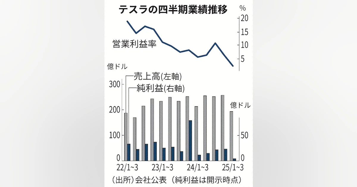 米EV大手テスラが22日発表した1~3月期決算は営業利益が前年同期比66%減の3億9900万ドルだった。最量販車「モデルY」を投入した2020年以降、四半期で最大の減益幅。政権入りしたイーロン・マスクCEOの政治発言への反発から世界に広がった不買運動が響いた。 nikkei.com/article/DGKKZO…