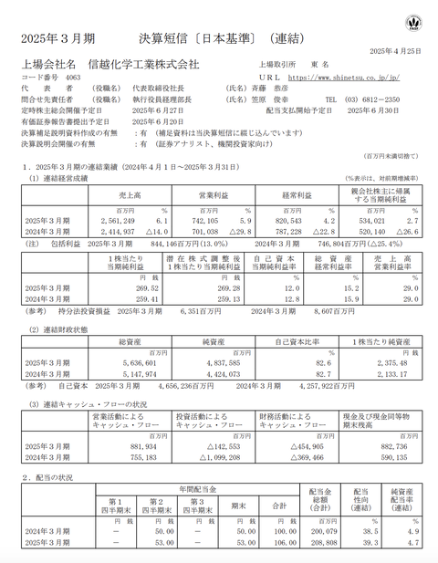 信越化学工業 2025年3月期通期決算 : 官報ブログ