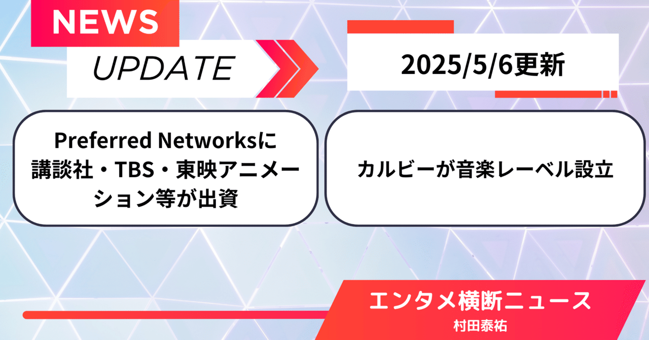 【#エンタメ横断ニュース】Preferred Networksに講談社・TBS・東映アニメーション等が出資、カルビーが音楽レーベル設立(25/5/6)|村田泰祐