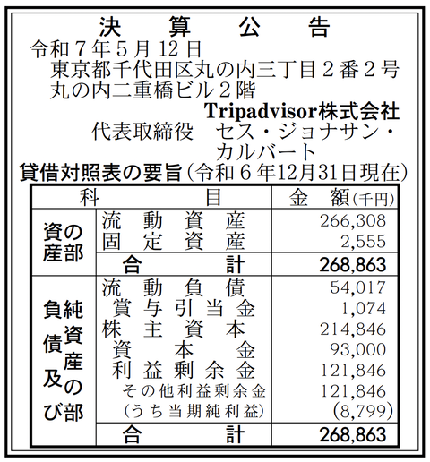 Tripadvisor(トリップアドバイザー) 決算公告(2024年12月期) : 官報ブログ