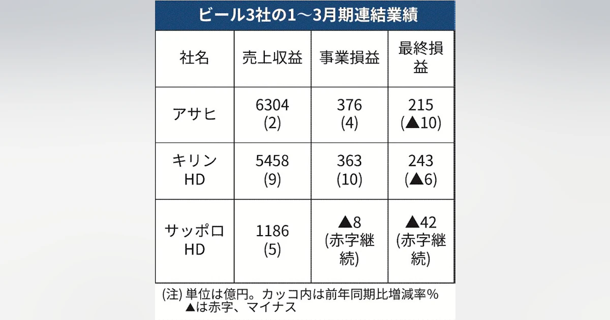 ビール大手、1~3月最終 キリンHD6%減益 サッポロHDは赤字拡大 - 日本経済新聞