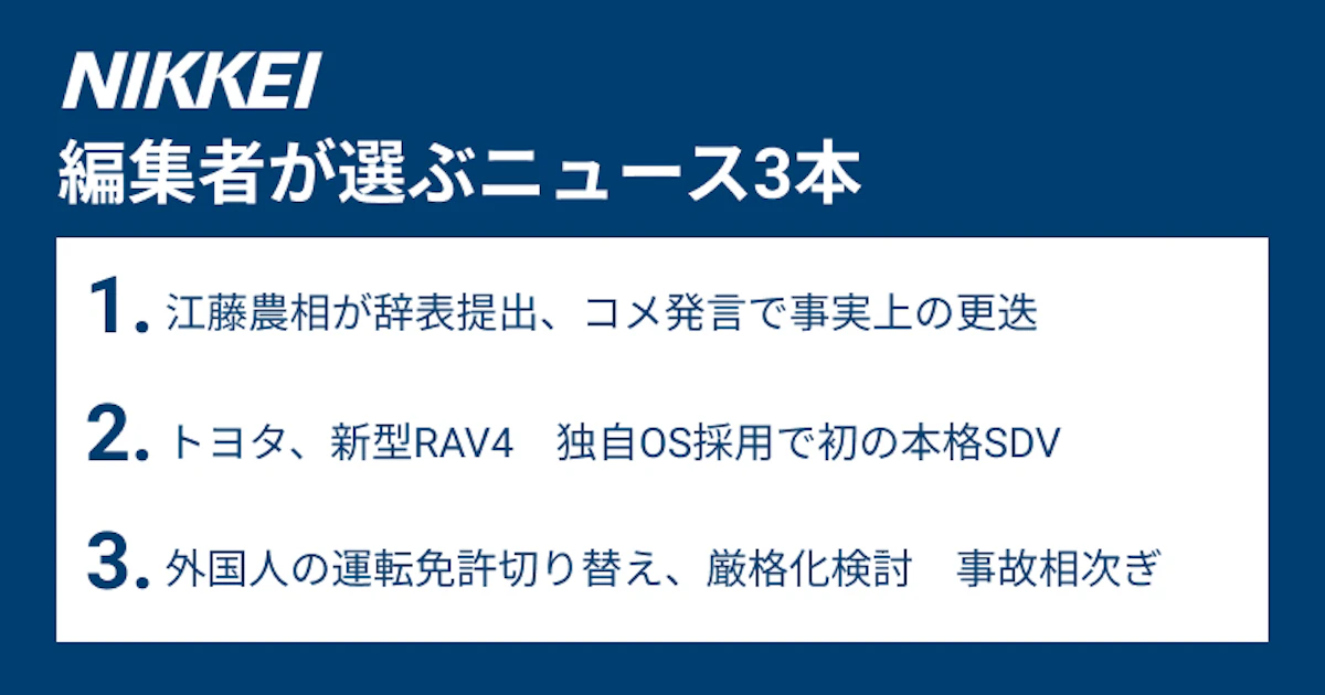 江藤農相が辞表提出・トヨタ新型RAV4・外国人の運転免許 - 日本経済新聞