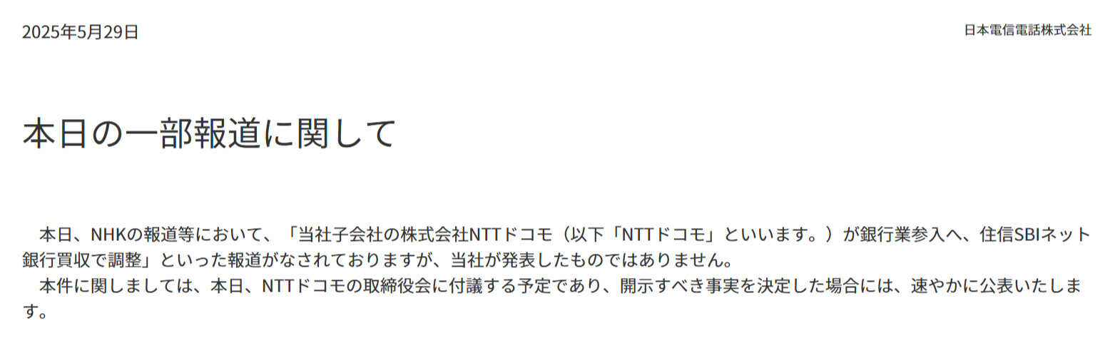 ドコモ、住信SBI銀買収へ「本日の取締役会に付議」