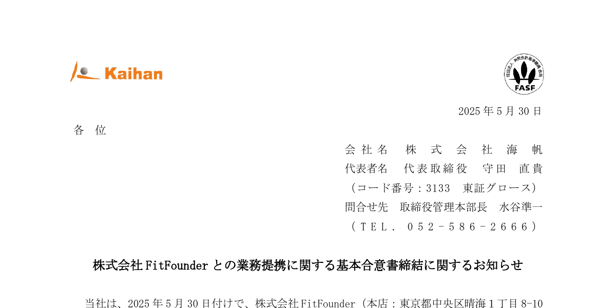 株式会社FitFounderとの業務提携に関する基本合意書締結に関するお知らせ | G-海帆(3133 - 適時開示情報【iPhone/Android】