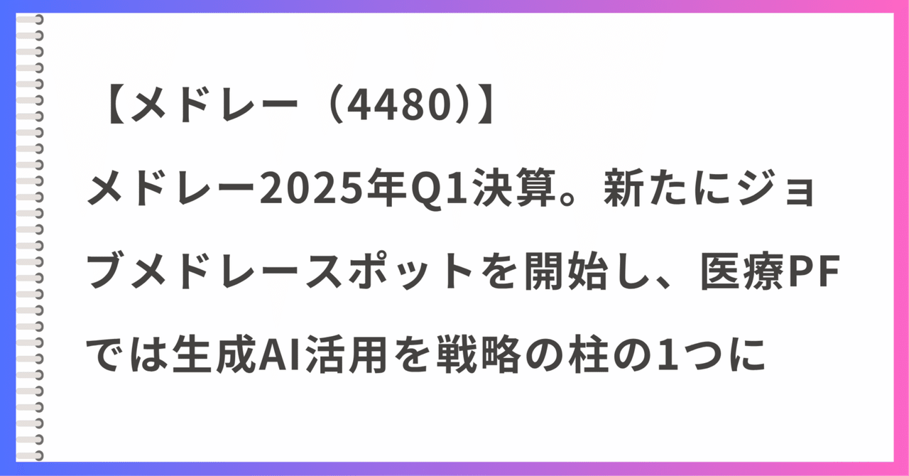 【4480】メドレー2025年Q1決算。新たにジョブメドレースポットを開始し、医療PFでは生成AI活用を戦略の柱の1つに|吉永和貴