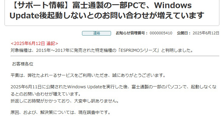 2015~2017年に発売された富士通製デスクトップPCで「Windows Update」後に起動できない事象 大塚商会 itmedia.co.jp/pcuser/article…