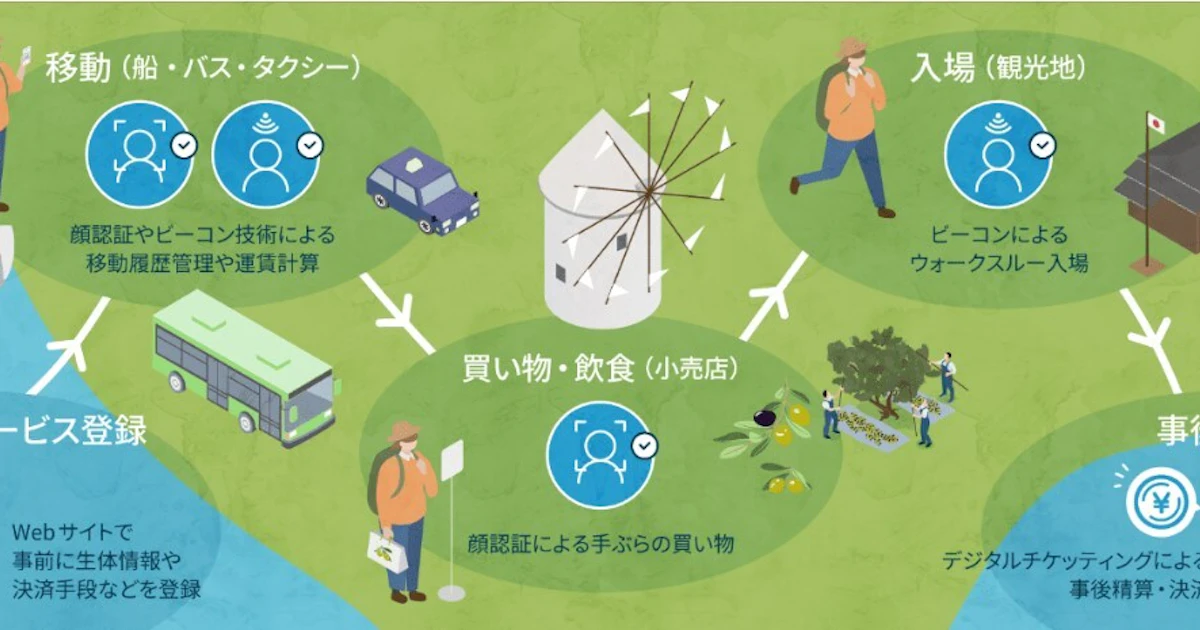 観光客が生体情報や決済手段を事前登録すると、顔認証でフェリーやバス、施設などを利用できる。スマホ上で発券。代金は後日精算。/日本経済新聞 nikkei.com/article/DGXZQO…