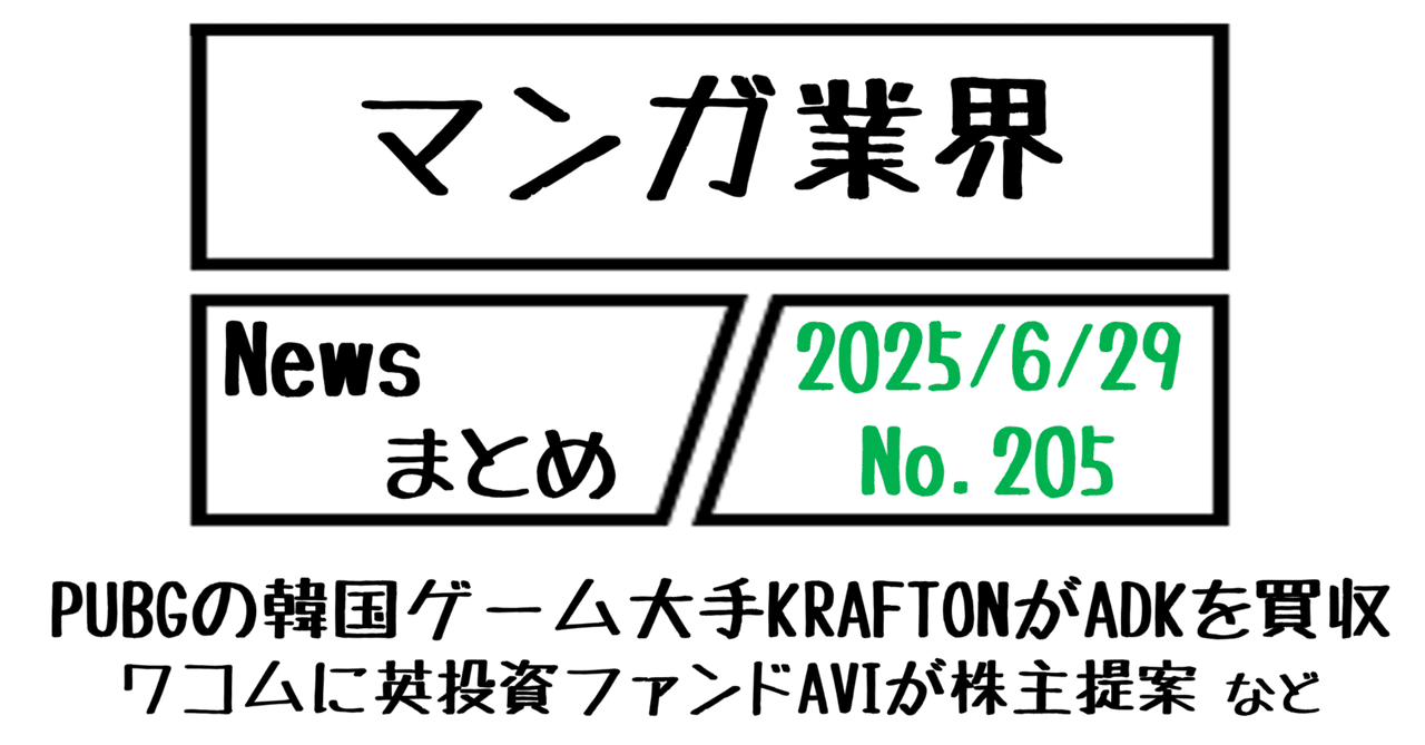 【マンガ業界Newsまとめ】PUBGの韓国ゲーム大手KRAFTONがADK買収、ワコムに英投資ファンドAVIが株主提案 など|6/29-205|菊池健