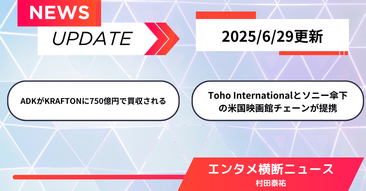 【#エンタメ横断ニュース】ADKがKRAFTONに750億円で買収される、Toho Internationalとソニー傘下の米国映画館チェーンが提携(25/6/29)|村田泰祐