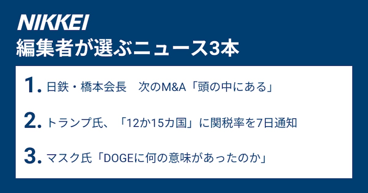 日鉄、次のM&Aは・米関税率「12か15カ国」に通知へ・マスク氏応酬 - 日本経済新聞
