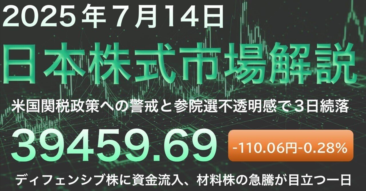 【2025年7月14日】日本株市場解説 日経平均は3日続落、39,459円 米関税強化懸念&参院選の不透明感が重し。半導体は売られ、ディフェンシブな電気・ガスが堅調。 注目銘柄は43%高のストップ高!詳細は👇 #日本株 #投資 #日経平均 note.com/cameranote/n/n…