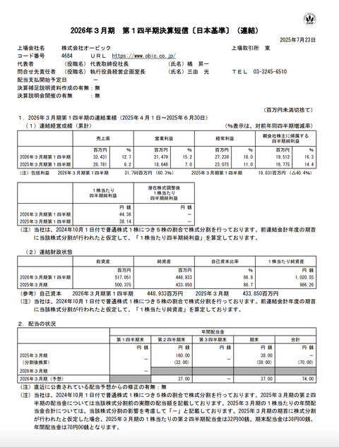 オービック 2026年3月期第1四半期決算 : 官報ブログ