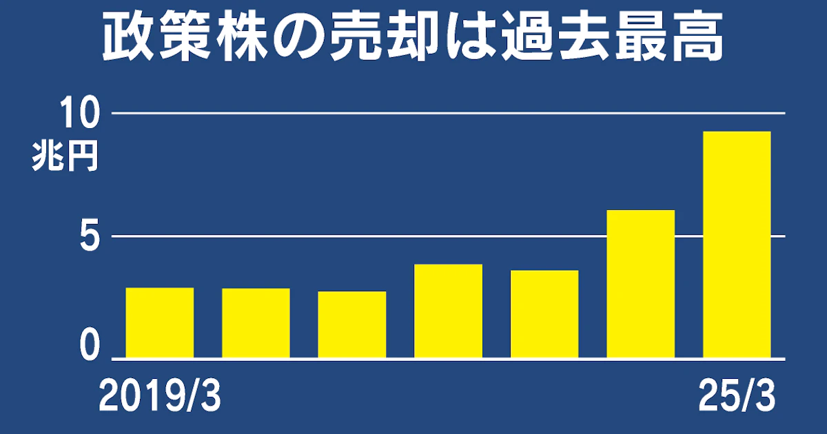 >政策株の売却額は53%増の9兆2555億円と、開示が始まった19年3月期以降で最大だった24年3月期を大きく上回った。 政策株売却5割増の9兆円 トヨタや金融など、統治改革の契機に日本経済新聞 nikkei.com/article/DGXZQO…
