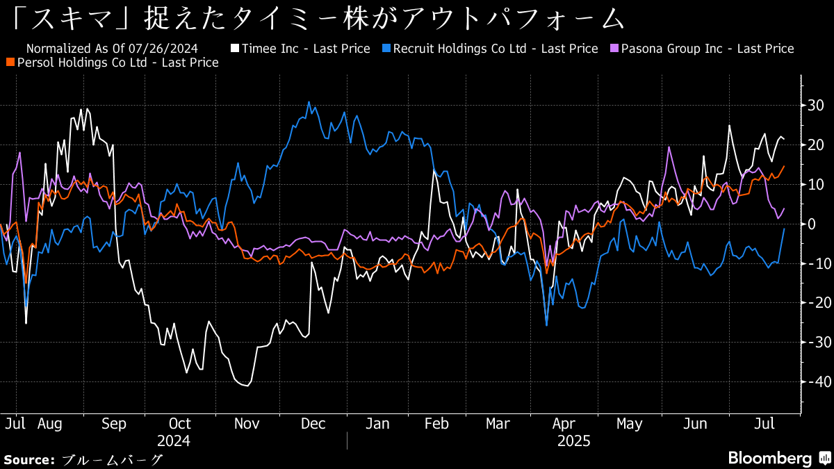 >タイミー株は、東京証券取引所への上場後1年間の上昇率が22%となり、同期間に10%上げたリクルートホールディングス、8%高のパソナグループなど主要な人材派遣会社を上回った。.co.jp/news/articles/…