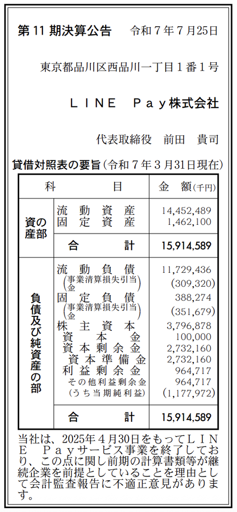 kanpo.blog.jp/archives/44909… 2025年4月30日をもって日本国内でのサービスを終了した LINE Payの決算です 第11期 決算公告 当期純利益億7797万円 利益剰余金億6471万円