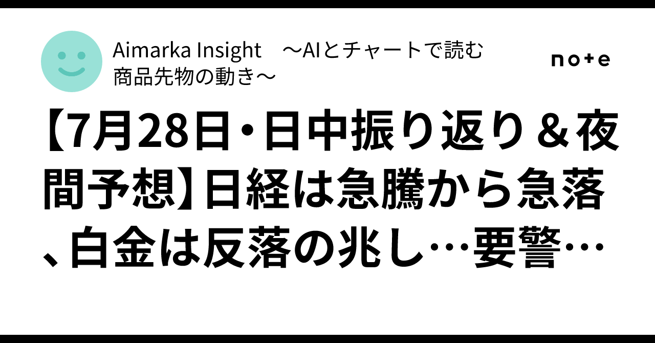 【7月28日・日中振り返り&夜間予想】日経は急騰から急落、白金は反落の兆し…要警戒の夜へ|Aimarka Insight ~AIとチャートで読む商品先物の動き~