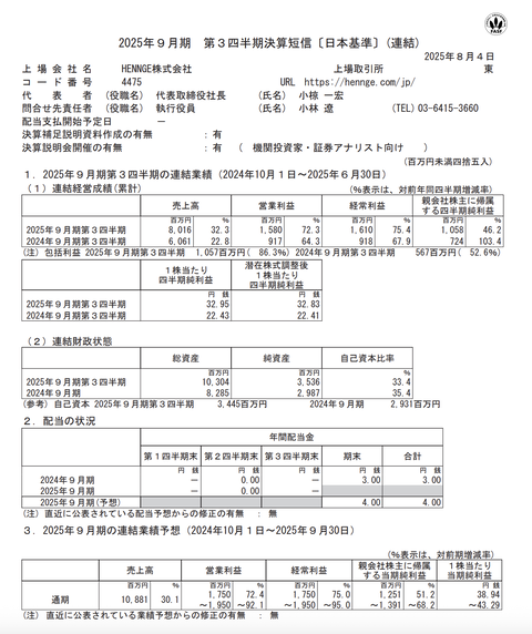 HENNGE 2025年9月期第3四半期決算 : 官報ブログ