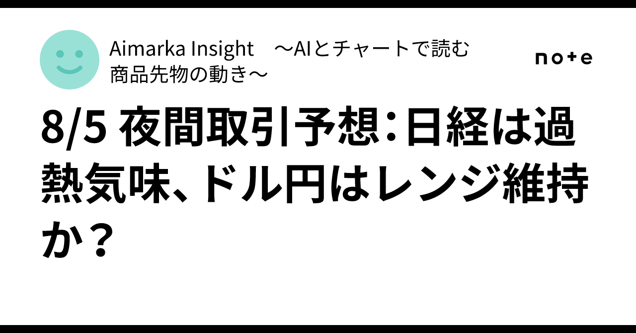 8/5 夜間取引予想:日経は過熱気味、ドル円はレンジ維持か?|Aimarka Insight ~AIとチャートで読む商品先物の動き~