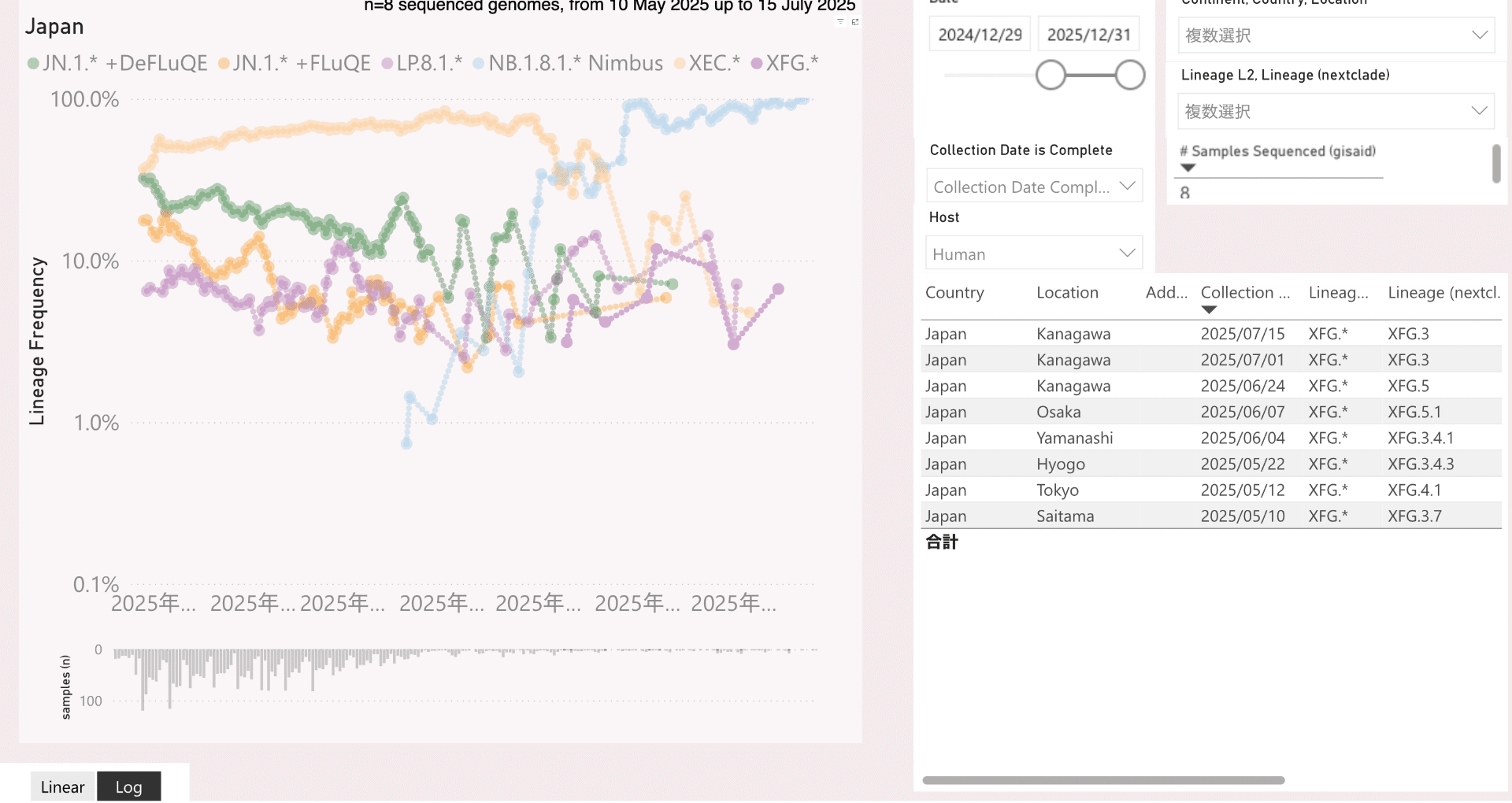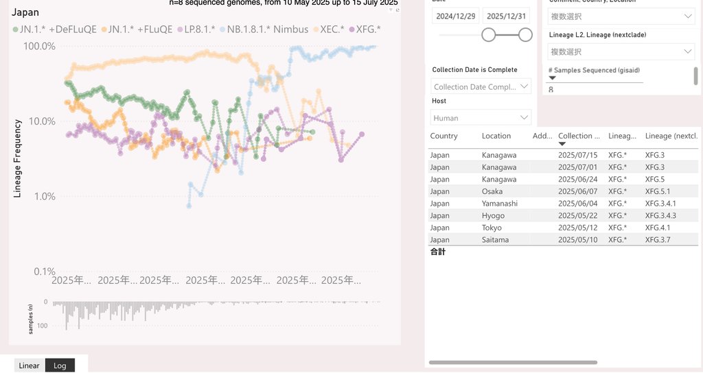 "夏季13th Surge定点30W現況と予測.D." note.com/bb45_colorado/… 連休を含むために休日効果補正をしています。 25年夏季13rd Surgeの支配株は、NB.1.8.1です。すでに13th Surgeは、全都道府県で発現し、過半の都府県で指数関数的成長を示しています。