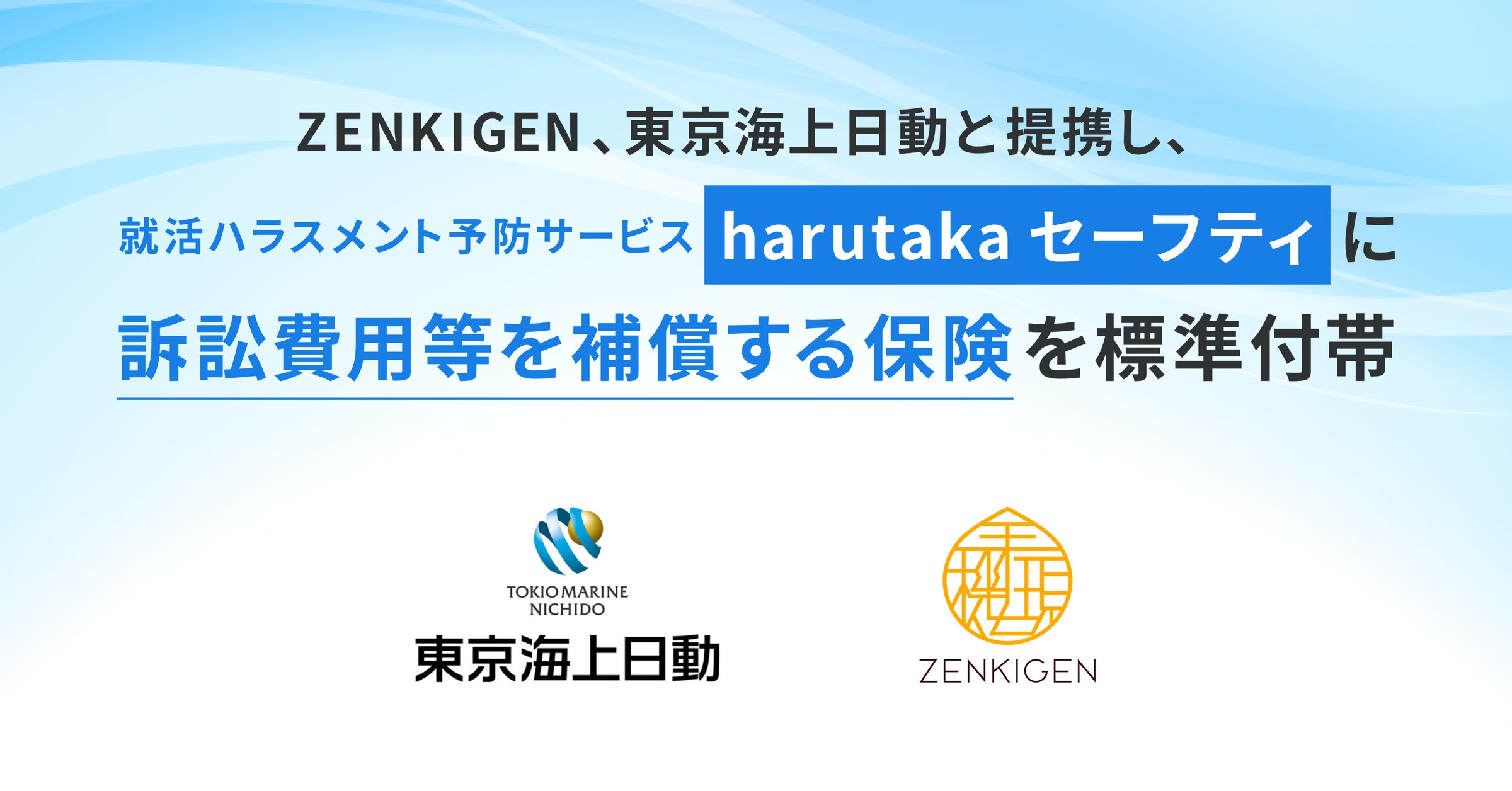 ZENKIGEN、東京海上日動と提携し、就活ハラスメント予防サービス『harutaka セーフティ』に訴訟費用等を補償する保険を標準付帯