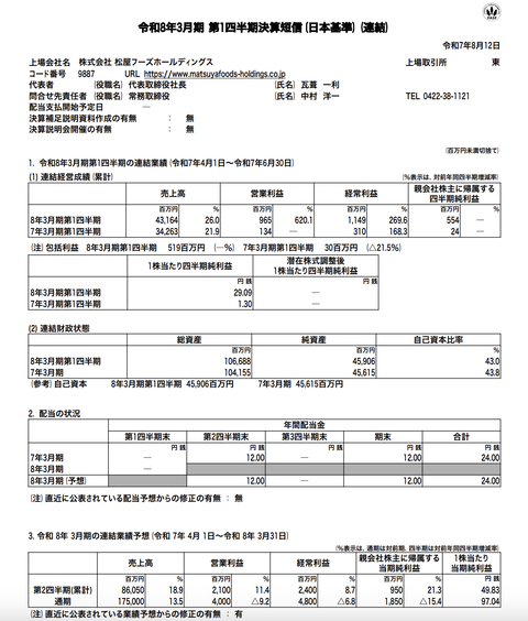 松屋フーズHD 2026年3月期第1四半期決算 : 官報ブログ