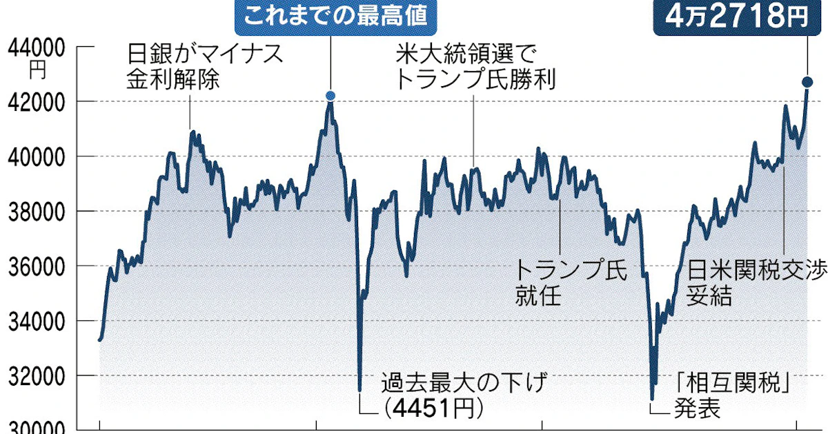 マネー膨張、減益下の株高 日経平均4万2718円 最高値更新、米関税の影響楽観 - 日本経済新聞