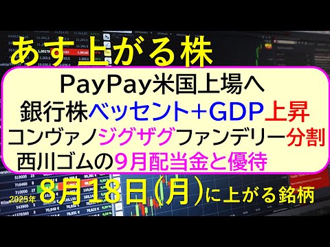 あす上がる株 2025年8月18日に上がる銘柄。PayPay米国上場へ。銀行株、ベッセント+GDP上昇。コンヴァノ、ジグザグ、ファンデリ… rizumu.net/movie/%E3%83%8…