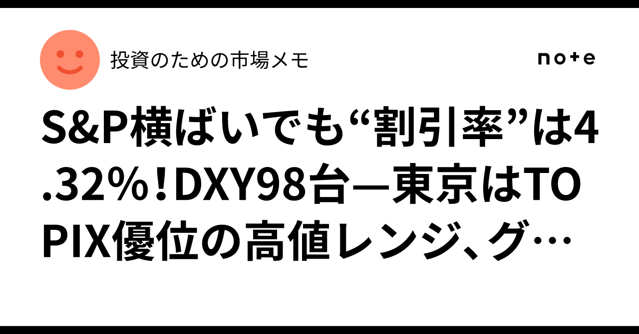 S&P横ばいでも“割引率”は4.32%!DXY98台—東京はTOPIX優位の高値レンジ、グロースは選別相場へ【8/19】|投資のための市場メモ