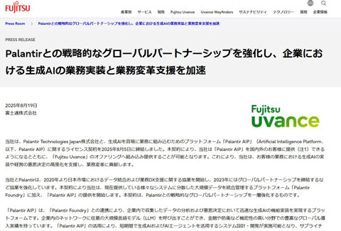 富士通、Palantirとの戦略的提携を強化 企業における生成AIの業務実装と業務変革支援を推進